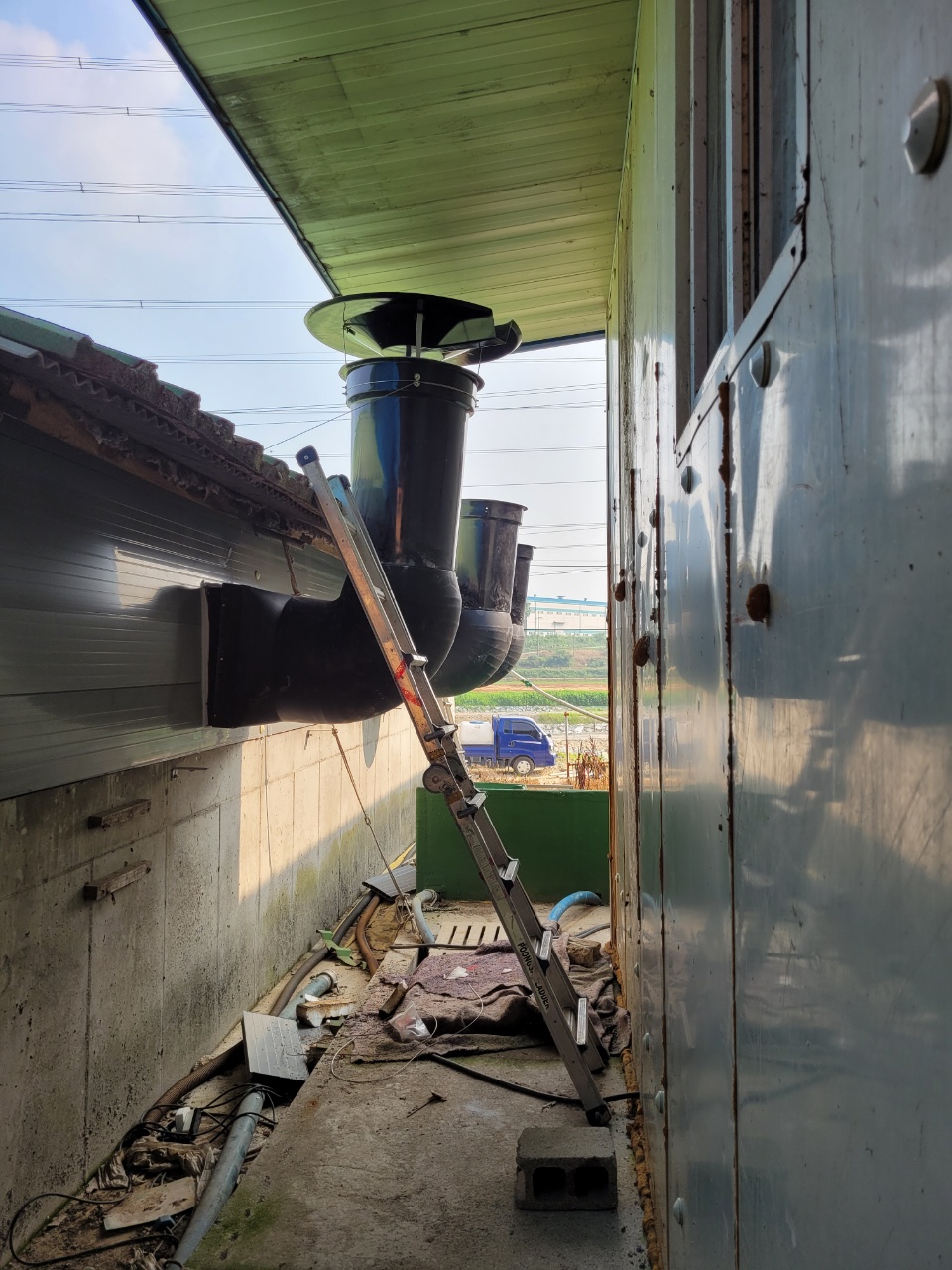 작업내역 : 벽체타공후 벽면휀 12개소, 입기창 타공후 14개소 설치완료 / 벽면휀 연결대 스텐와이어 이용 고정작업중