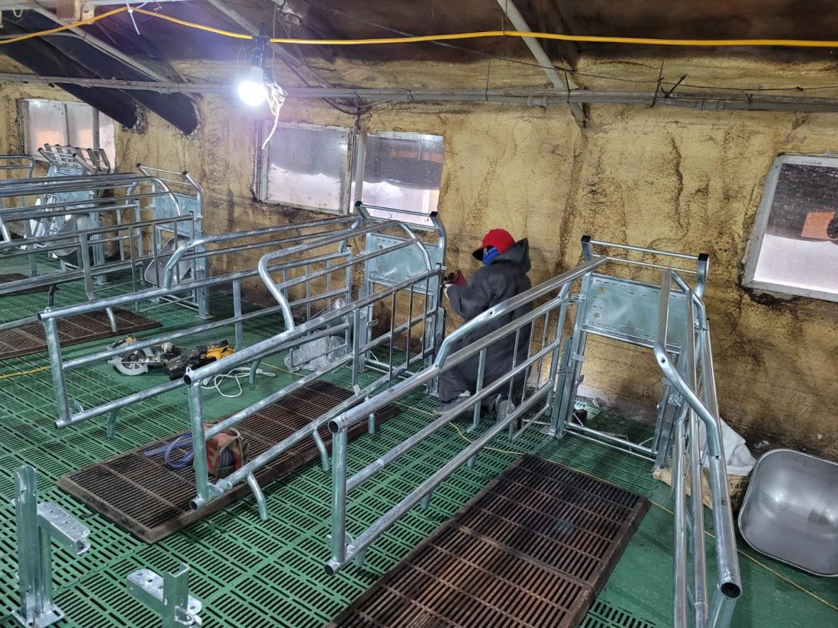 작업내역 : 플라스틱 베드 설치완료 / 분만틀 조립 및 칸막이 조립중